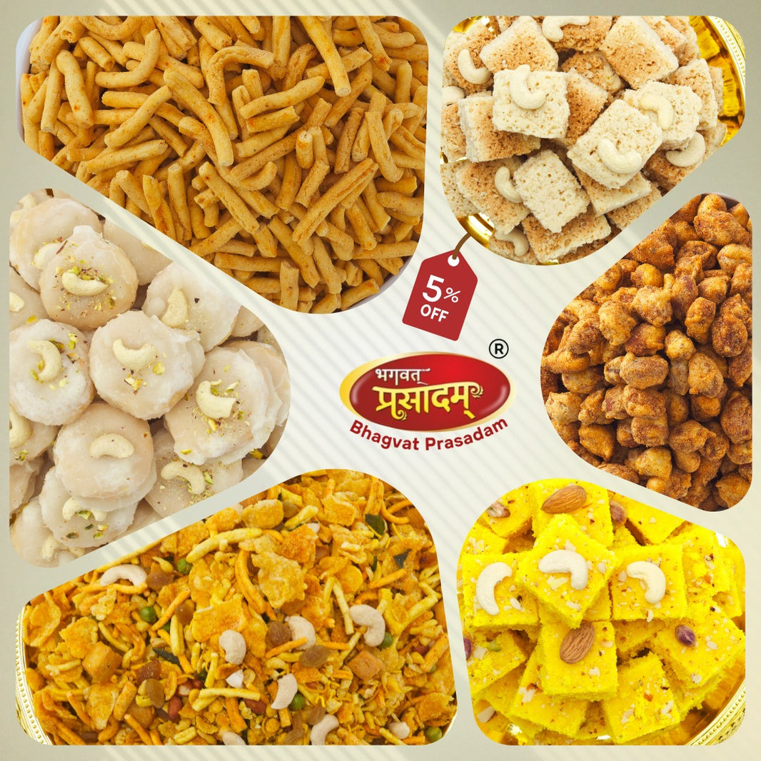 Bhagvat Prasadam is a sacred initiative that offers sweets and namkeen, first presented as an offering to the divine and then shared with people as blessed prasadam.